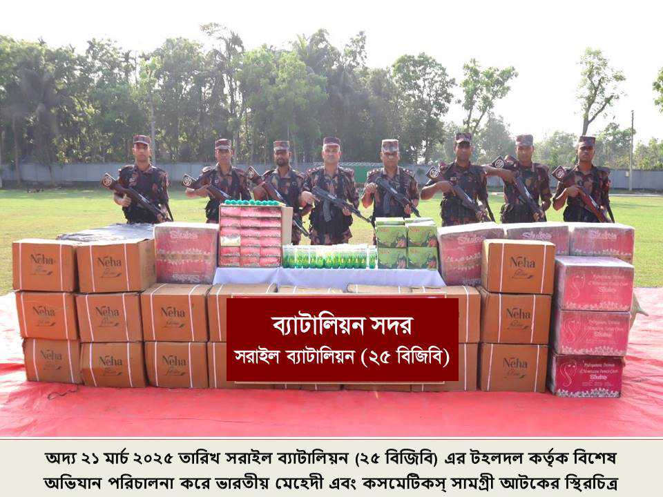 অদ্য ২১ মার্চ শুক্রবার আনুমানিক ভোর সকাল ০২,১৫ ঘটিকায় সরাইল ব্যাটালিয়ন (২৫ বিজিবি) এর বিশেষ টহলদল কর্তৃক গোপন সংবাদের ভিত্তিতে সীমান্ত পিলার ২০০১/এমপি হতে আনুমানিক ০৫ কিলোমিটার বাংলাদেশের অভ্যন্তরে ব্রাহ্মণবাড়িয়া জেলার বিজয়নগর উপজেলার ইব্রাহিমপুর নামক এলাকায় বিশেষ অভিযান পরিচালনা করা হয়। উক্ত অভিযানে ভারতীয় *মেহেদী-৩১,০০০ পিস এবং কসমেটিকস্ সামগ্রী-৪,৫৭৬ পিস* আটক করতে সক্ষম হয়। আটককৃত অবৈধ চোরাচালানী মালামালের সিজার মূল্য *৪২,৯০,০০০/- (বিয়াল্লিশ লক্ষ নব্বই হাজার)* টাকা। আটককৃত ভারতীয় চোরাচালানী মালামাল আখাউড়া কাষ্টমস্ অফিসে জমা করার কার্যক্রম প্রক্রিয়াধীন রয়েছে।