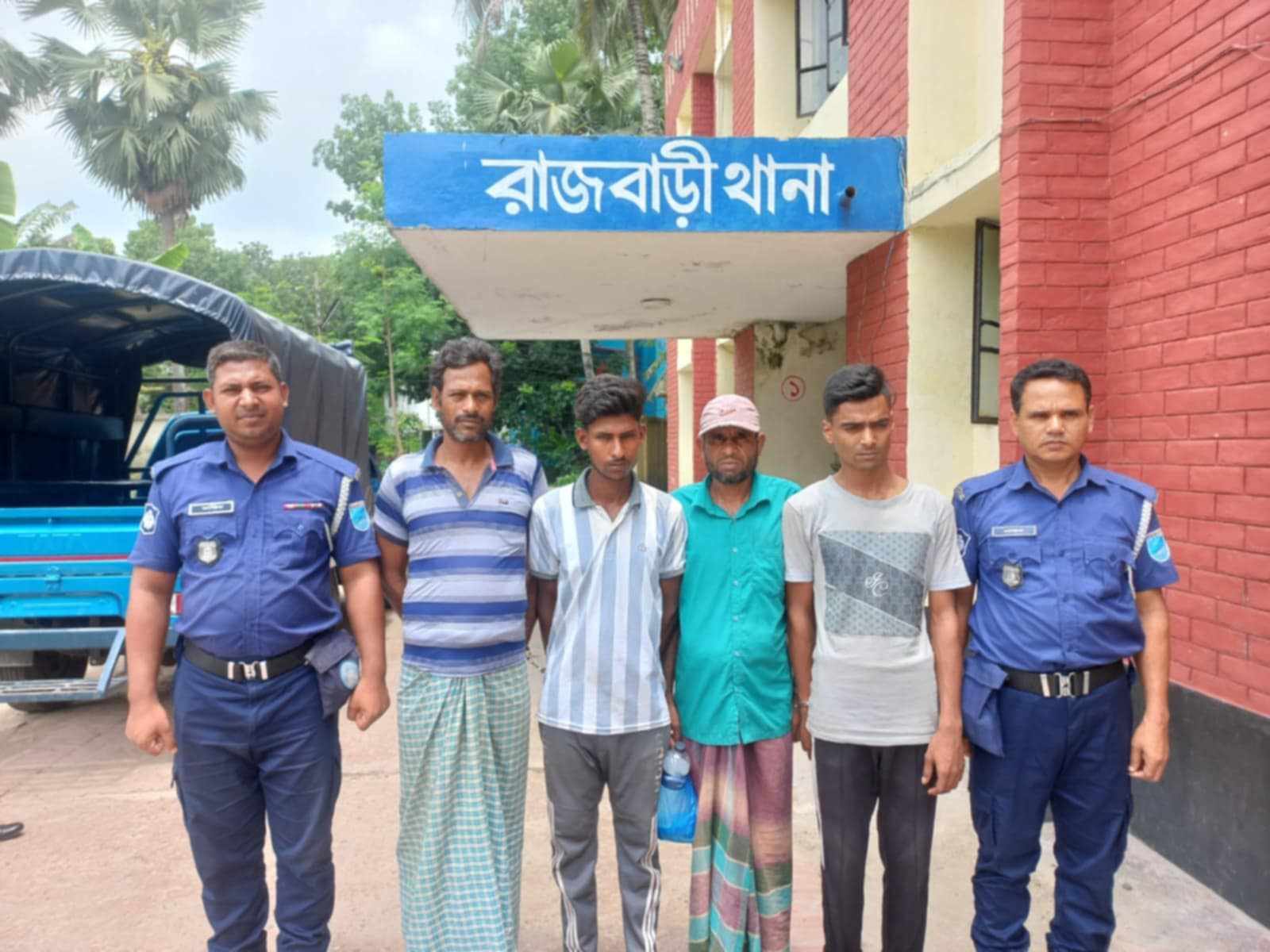 উক্ত অভিযান চালিয়ে , ১/ মোজাফ্ফর বিশ্বাস (৪৩), পিতা-মৃত গোলাপ বিশ্বাস, গ্রাম – চর বাগমারা, ইউপি- রামকান্তপুর, থানা ও জেলা-রাজবাড়ী তাকে নিজ বসতবাড়ী থেকে গ্রেফতার করেন, ২। মোঃ কাঞ্চন মিয়া (২৮), পিতা-মোঃ তোতা মিয়া, গ্রাম – সজ্জনকান্দা, থানা ও জেলা-রাজবাড়ীকে নিজ বসতবাড়ী থেকে গ্রেফতার করেন, ৩। মোঃ পাভেল পাঠান (২২), পিতা-মোঃ আলম পাঠান, গ্রাম – খানখানাপুর (হঠাৎ পাড়া), থানা ও জেলা-রাজবাড়ীকে নিজ বসতবাড়ী থেকে গ্রেফতার করেন, ৪। শহিদুল ইসলাম (৪৭), পিতা-নুর মোহম্মদ শেখ, গ্রাম – সজ্জনকান্দা (পৌরসভা ০৫ নং ওয়ার্ড), থানা ও জেলা-রাজবাড়ী তাকে নিজ বসতবাড়ী থেকে গ্রেফতার করেন। গ্রেফতার কৃত আসামীদেরকে পুলিশ স্কটের মাধ্যমে বিজ্ঞ আদালতে প্রেরন করা হয়েছে বলে জানা গেছে।