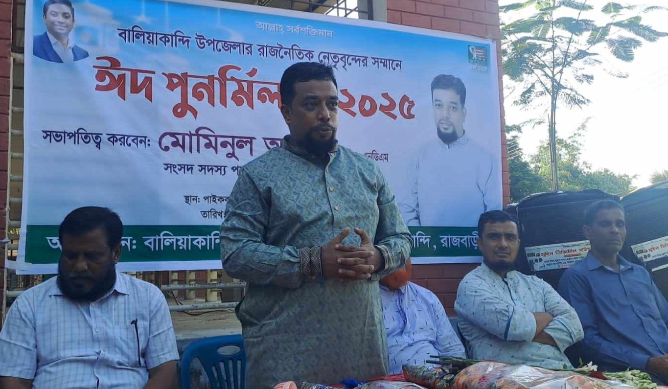 আসন্ন ত্রয়োদশ জাতীয় সংসদ নির্বাচনে রাজবাড়ী-২ আসন থেকে সংসদ নির্বাচন করার প্রস্তুতি নিচ্ছেন জাতীয়তাবাদী গণতান্ত্রিক আন্দোলন (এনডিএম) এর মহাসচিব মোমিনুল আমিন। এ উপলক্ষ্যে বালিয়াকান্দিতে সবদলের অংশগ্রহণে ঈদ পুনর্মিলনী ২০২৫ অনুষ্ঠিত হয়েছে। বৃহস্পতিবার বিকেলে রাজবাড়ীর বালিয়াকান্দি উপজেলার সদর ইউনিয়নের পাইক কান্দি সরকারী প্রথমিক বিদ্যালয় মাঠে এই ঈদ পুনর্মিলনী অনুষ্ঠান অনুষ্ঠিত হয়